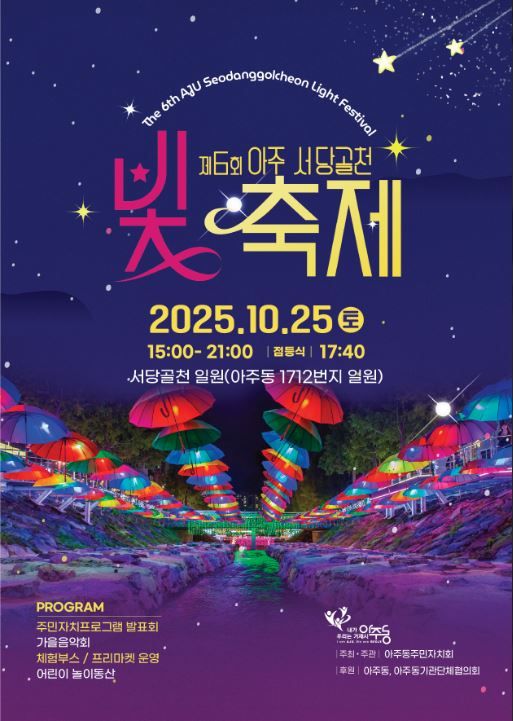 거제 아주동 서당골천을 따라 다양한 조명과 포토존이 설치되는 야간 빛축제로, 가족·연인과 함께 산책하며 아름다운 불빛을 즐길 수 있는 도심 속 힐링형 축제이다. 지역 주민들이 직접 참여해 만든 따뜻한 분위기의 축제로,프리마켓·체험부스·공연 등도 함께 열려 지역 공동체와 관광이 어우러지는 축제로 자리잡고 있다.